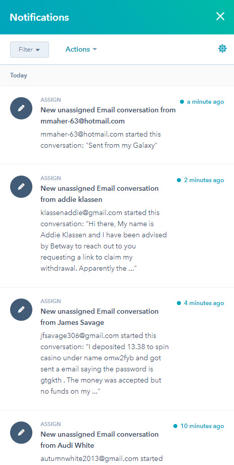 HubSpot is the platform that we use for our Merchant and Customer Service correspondence. It allows us to organize our email chains of correspondence with merchants and end users into tickets so that we can organize them based on responses and merge threads together should multiple email chains and responses be involved. HubSpot also helps us create a single platform to respond to merchants and end users by only using the tx_inquiry or CSR email addresses respectively, reducing the chance of an end user only responding to one member of the csr team, and increases the efficiency with which we can resolve any problems that may impact our services or the experiences of merchants and end users.