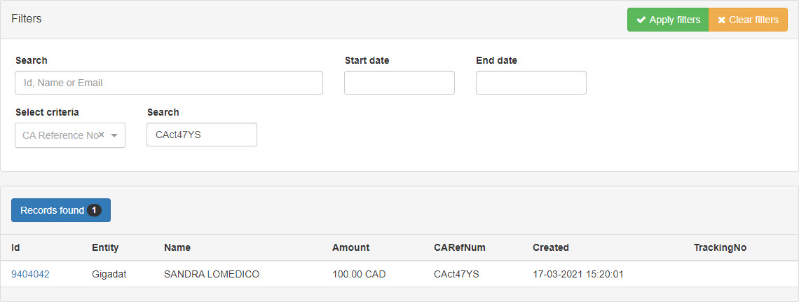 - Criteria - This is a secondary search where you can search for transactions using the tracking ID, amount, name, Agg id, CA Reference number and type.