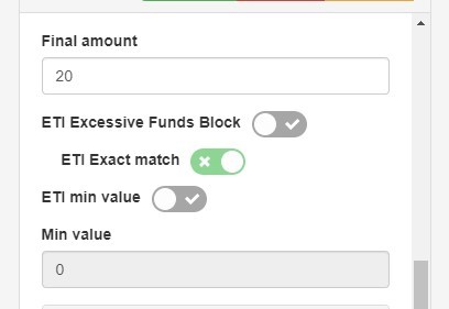 - Block switches - There are 3 different restrictions that a merchant can request for their transactions; Excessive funds, Exact match and Minimum value. If any of these are green, then that block is active, and can reject deposits that violate the conditions of that block.